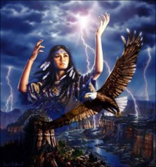 Two weeks later, under a dark evening sky that found the couple within a few miles of where Maka Cesli’s band was camped, Ina spoke to Thomas.  “Listen to me my husband. I have powers that you do not have. I am afraid for you. I will soar once again as an eagle in the night. With my Owl vision I will see all that I need to know. I will descend within the camp and kill Maka Cesli. Then after I have humiliated him, with my talons I will grab up my daughter and return here to you. I must warn you. If they have given honor to the Unkcegila, then the Unkcegila will try to stop me. They are evil spirits that roam the land and hate those that are good. As an Eagle I can fly safely above them but you will be as a mouse to a hawk. I must chant a song of protection over you. Be still and say nothing. Whatever you see, do not let it frighten you. I am singing a song of the giant warrior. He will ride across the sky mocking the Unkcegila and daring them to attack him. They will spit and scream at him as he passes above them. The Giant Warrior will keep the eyes of the Unkcegila upon him and away from you. When I return, the Giant Warrior will become as a mountain and crush the Unkcegila under his weight. He will sit upon them until we are safe and far away.”